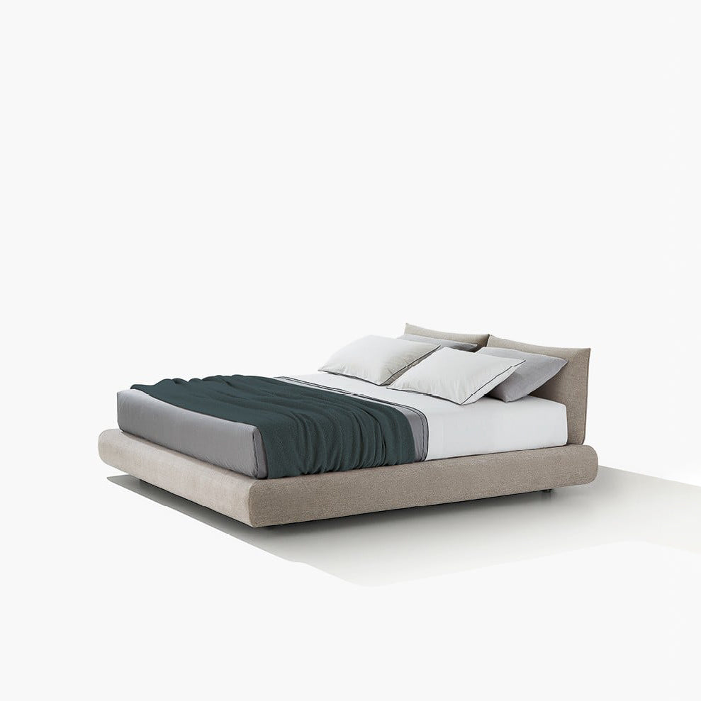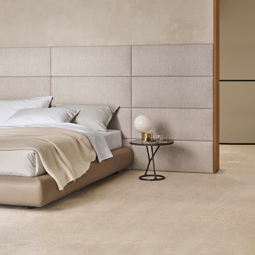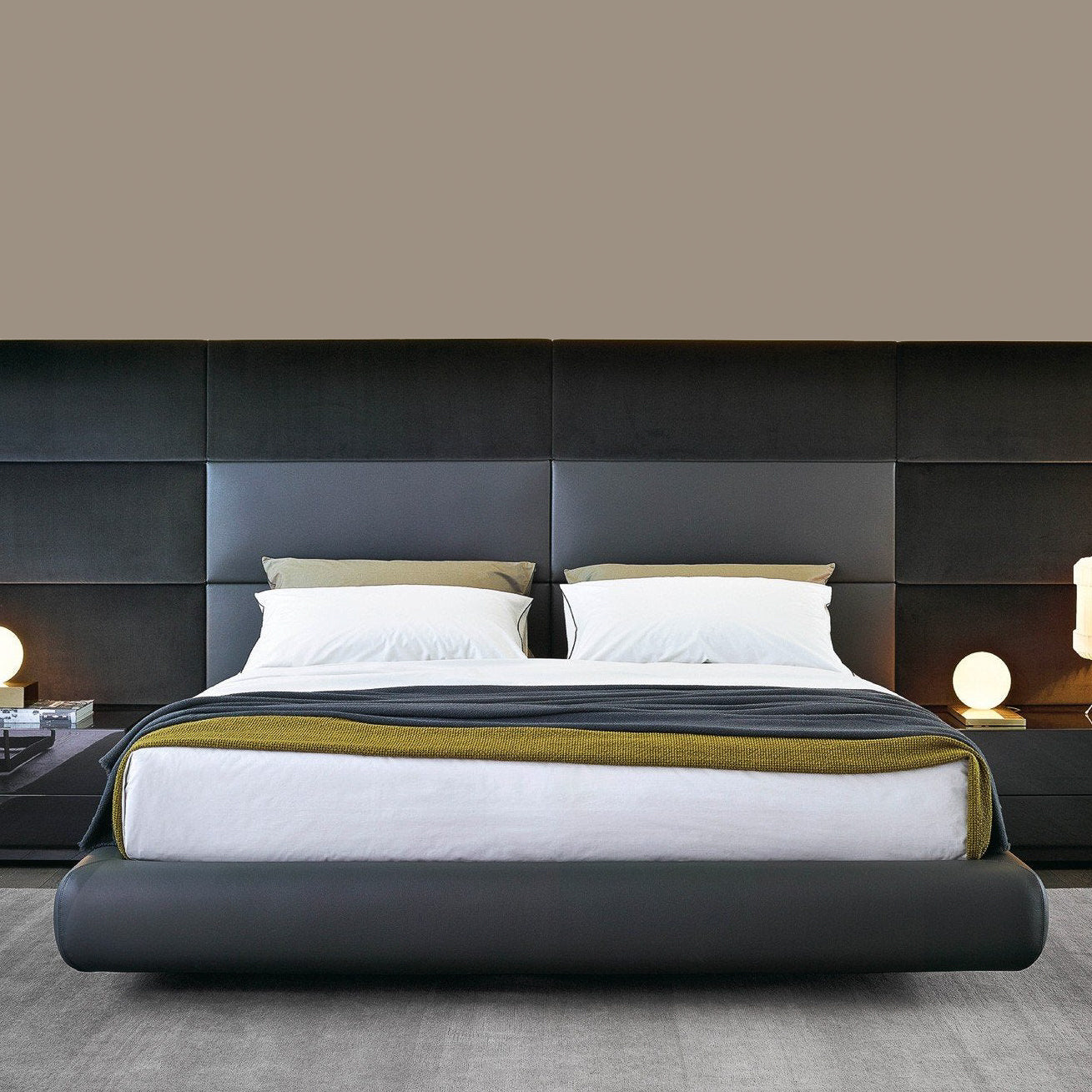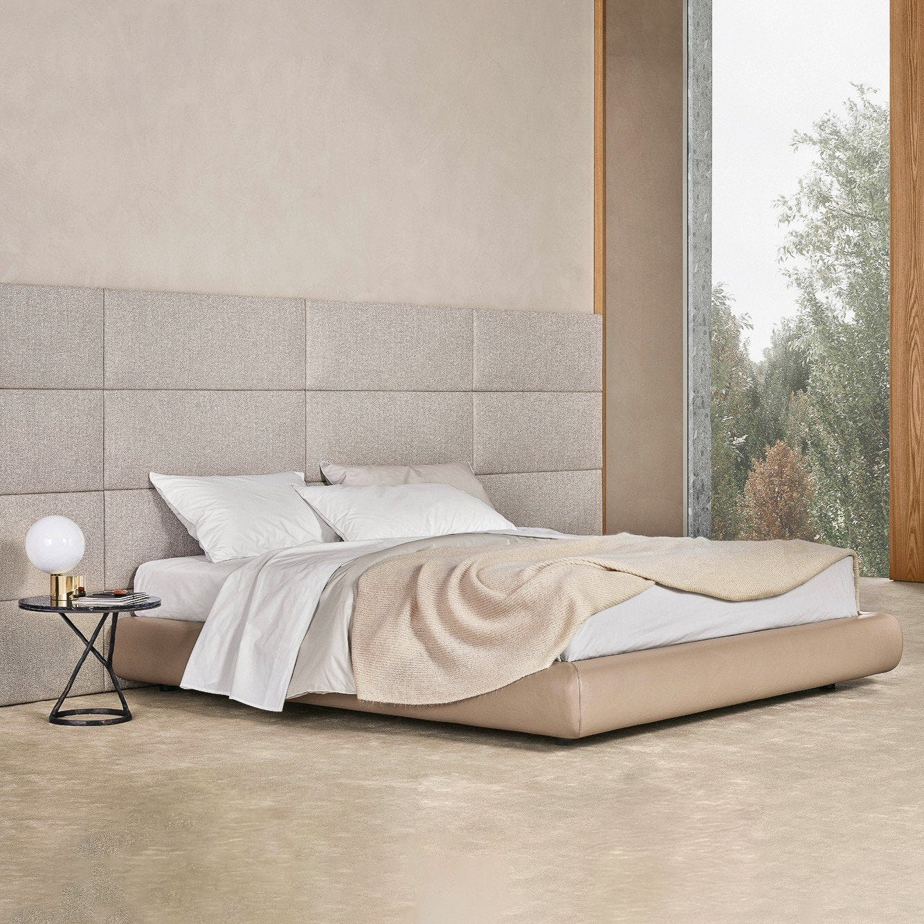 Dream is a bed with a contemporary feel that combines a base with rounded and essential lines with a system of cushioned panels, with which to furnish the sleeping area in an original and personalized way. Ideal both for homes and hotels, the bed is available in three versions: with wall paneling, where the panels, individually upholstered in fabric or leather, act as headboard and boiserie; with a cushioned headboard and without. The Dream bed is available with a fixed, anatomical, or folding bed base featuring a storage compartment. The optional pair of rollers makes it even more comfortable.