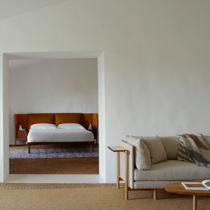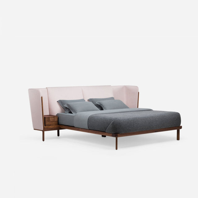The wraparound headboard provides a sense of privacy, while the exposed timber frame and generous expanse of upholstery celebrates the quality of materials and craft. Suitable for residential or contract environments, the bed is available with a low or tall headboard, with or without integrated bedside tables.