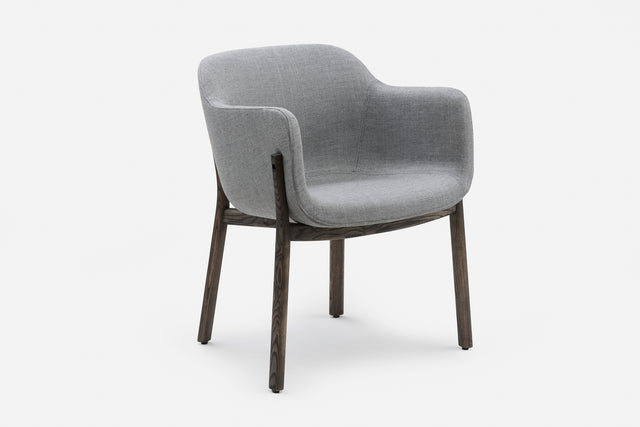 Porto is a comfortable tub dining chair with an exposed timber structure. Elegant and refined, its wraparound form is an expression of support, offering retreat. The slender timber leg frame, joined with mortise and tenon, crosses underneath the seat to visually lighten the form.