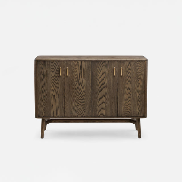 Solo Cabinets reflect the same warm modern aesthetic, thoughtful functionality, soft curved edges, and beautiful detailing of the rest of the series. The solid wood cabinets feature machined brass handles and an elegant leg frame. Cable management, adjustable internal shelving, and optional internal storage trays, available separately, optimize organization and connect to the shelves with hidden magnets.
