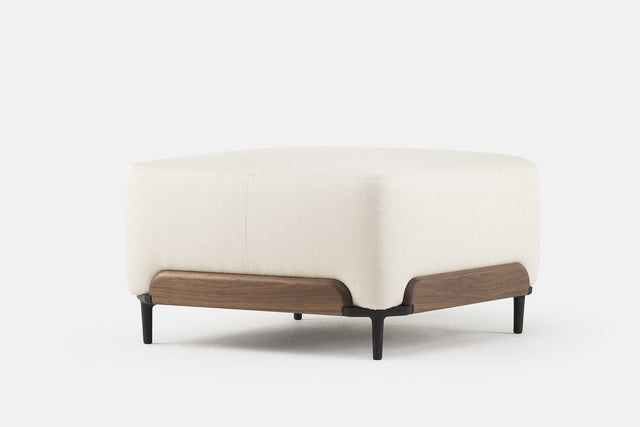 Gemstones set into jewelry were the starting point for Steve, a series of upholstered poufs by Luca Nichetto. Steve features short cast iron legs that support a visible wooden structure crowned with upholstery. Available in two sizes.