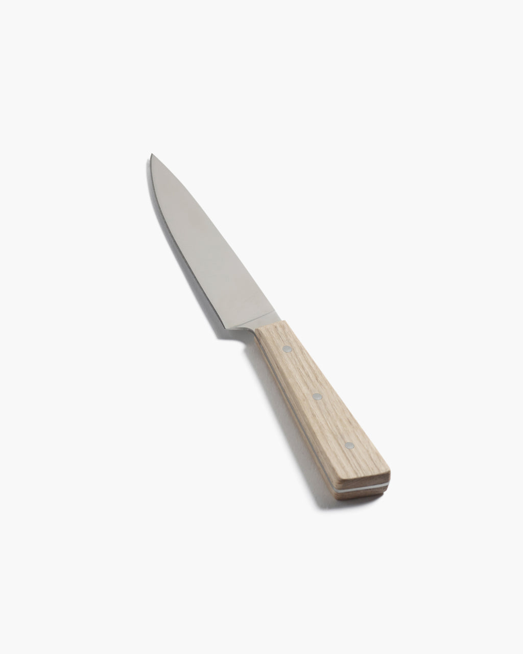 The collection of Dune knives features a chef’s knife, a paring knife, and a steak knife and stands out because of the beautiful ash or walnut wood handles. This perfectly balanced knife set adds texture to any table setting with its contrasting materials.
