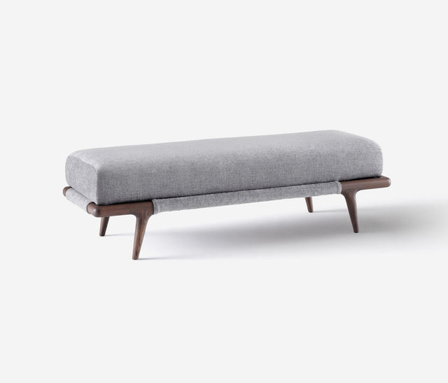 The Gaudí bench explicitly takes up again the distinctive features of the bed and upholstered items in the same series, with exposed solid curved wooden feet (in natural, coffee-stained and black-stained ash or natural and coffee-stained iroko finishes) and a soft upholstered seat, whose upholstery is embellished by visible seams. It is a versatile item that can be placed at the foot of a bed, in a transition area, or to complement a living room.