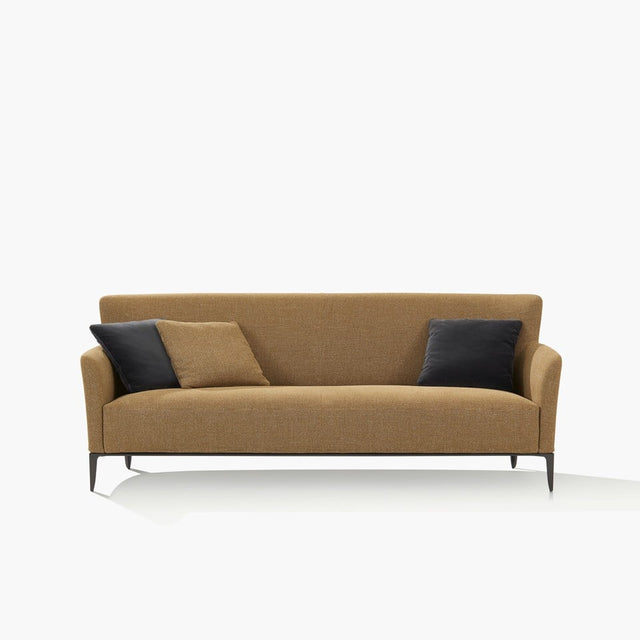 Gentleman’s Friends completes the Gentleman collection. It is a modern conversation sofa with two or three seats. Like the armchairs, it features a metal base with slender feet in different finishes, which can be customized according to the fabric or leather upholstery.