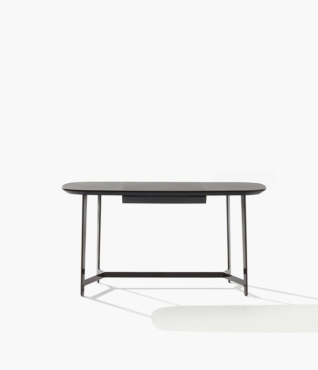 Mathieu is a contemporary desk characterized by a slender silhouette and graceful contours. The top, with a wood frame and leather insert, traces subtle curves that soften the strong lines of the painted metal structure. The optional accessories – the small drawer under the top and the mirror – are elegant and discreet, making it a perfect complement for bedroom spaces.