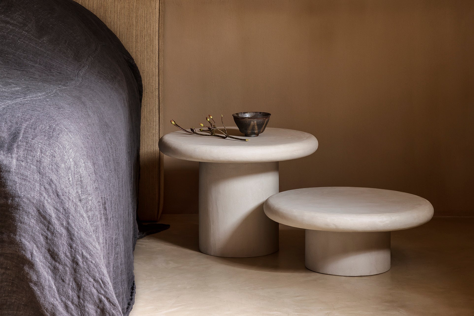 The Round Coffee Table, with its organic shape, is finished with lime plaster. It is a timeless element in the home for indoor use only.
