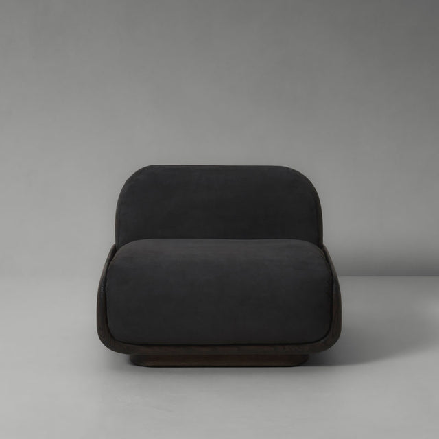 A low-lying lounge chair with a wooden frame and soft, rounded upholstered cushions. Available in French oak, and with your preferred covering from our collection of fabrics and leathers. The wooden structure, carved to resemble a scoop, cradles the plush pillows to elevate them from the ground, exuding a sense of heightened comfort.
